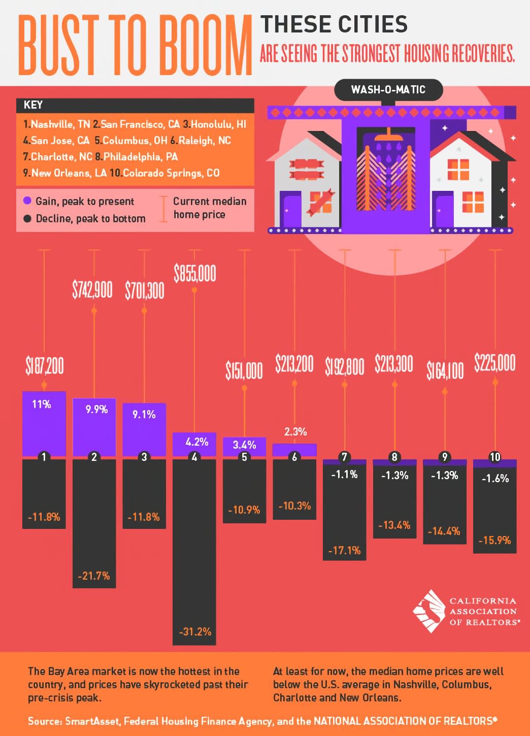 The National Association of Realtors reports that the Bay Area is now the top real estate market in the United States as prices exceed pre-recession levels. Currently, San Francisco’s median home price is $742,900 and San Jose’s median home price is $855,000, a large difference from other metro areas across the country.
